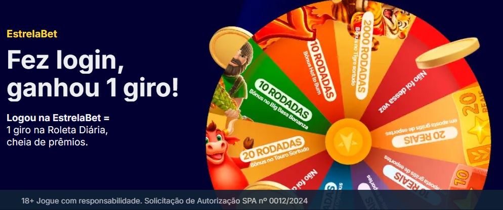 A EstrelaBet é uma casa licenciada no Brasil e com forte presença no mercado. Um dos seus maiores diferenciais é o depósito mínimo de apenas R$1 real com o método PIX, facilitando ao máximo o acesso dos jogadores. A grande atração do cassino é a Roleta Premiada gratuita todos os dias: ao fazer o primeiro login, você pode girar a roleta sem gastar nada do seu saldo e concorrer a diversos prêmios, como rodadas bônus em jogos famosos (Tigre Sortudo, Hot to Burn, Big Bass Bonanza, Touro Sortudo e Gates of Olympus), além de apostas grátis de até R$20 reais em esportes selecionados. Uma ótima oportunidade para se divertir com chances aumentadas.