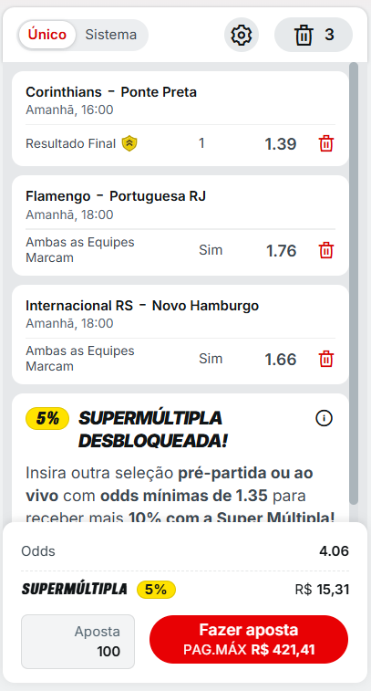 Para seguir o bilhete pronto é só clicar no botão a seguir e acessar a página da Superbet. O link já redireciona para a aposta e o bilhete na Superbet!