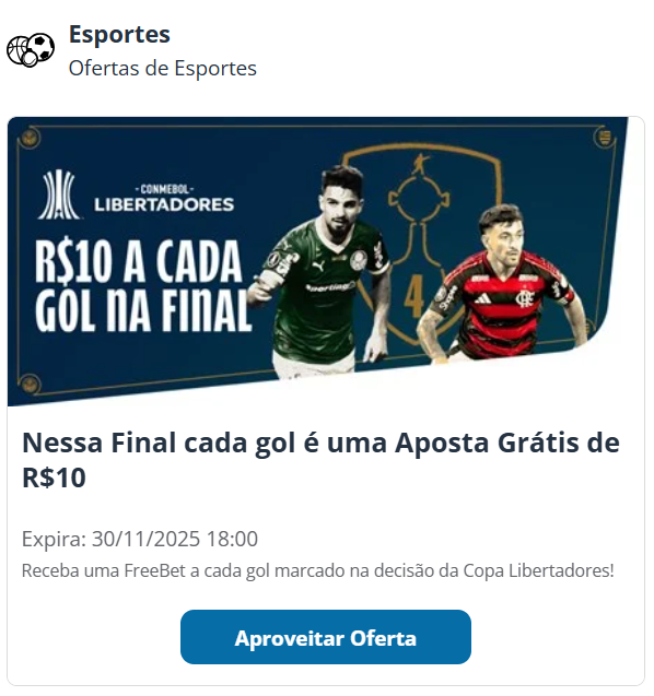 A Sportingbet está com uma baita promoção na grande final da Libertadores entre Palmeiras e Flamengo! Vamos conhecer o primeiro brasileiro Tetra da Libertadores e você não pode ficar de fora dessa promoção! Para cada gol feito na final, você ganha uma aposta grátis da Sportingbet!
