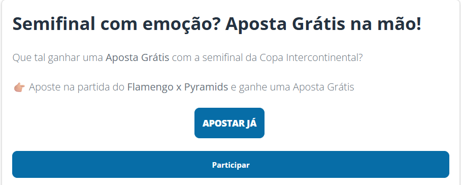 A Sportingbet está com uma baita promoção na semifinal do Mundial entre Flamengo e Pyramids! Vamos conhecer o desafiante do PSG na final e você não pode ficar de fora dessa promoção! Ao fazer a sua aposta no jogo, você ganha uma aposta grátis da Sportingbet!