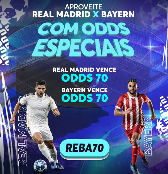 Para participar, basta utilizar o código promocional REBA70 no momento do cadastro. Você deve fazer uma aposta única de R$1 no mercado “Real Madrid vencer a partida (Resultado Final)” OU “Bayern de Munique vencer a partida (Resultado Final)” nas odds indicadas no site de apostas Novibet. Se a aposta for vencedora, os ganhos serão aumentados para o equivalente a 70.