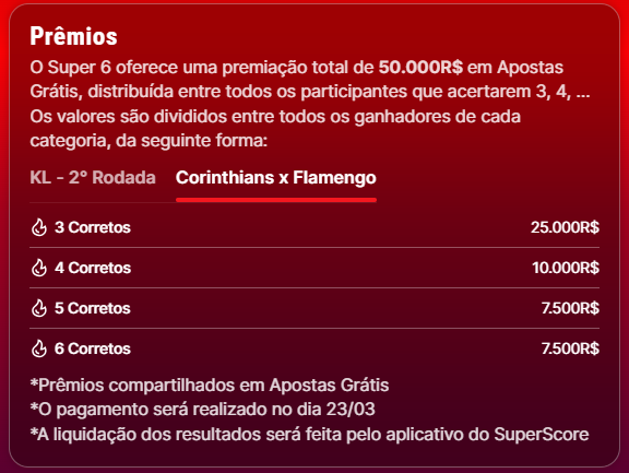 A quantidade de acertos que você tiver determina a sua premiação de apostas grátis. Veja as premiações: