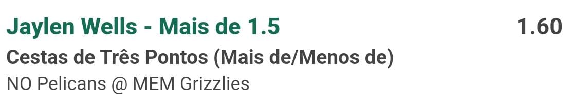 No último jogo da noite de hoje, temos um Pelicans mais uma vez desfalcado de Zion Williamson e mais alguns jogadores, contra um Memphis muito bem municiado com Ja Morant e cia. Procurando um mercado interessante para a partida que não fosse o handicap dos Memphis, que está alto, temos Jaylen Wells, do Memphis Grizzlies, com uma média de 2 cestas de 3 pontos por partida na temporada, e uma linha dentro da média do jogador. Nosso palpite é para Jaylen Wells acertar no mínimo duas cestas de 3 pontos na partida.